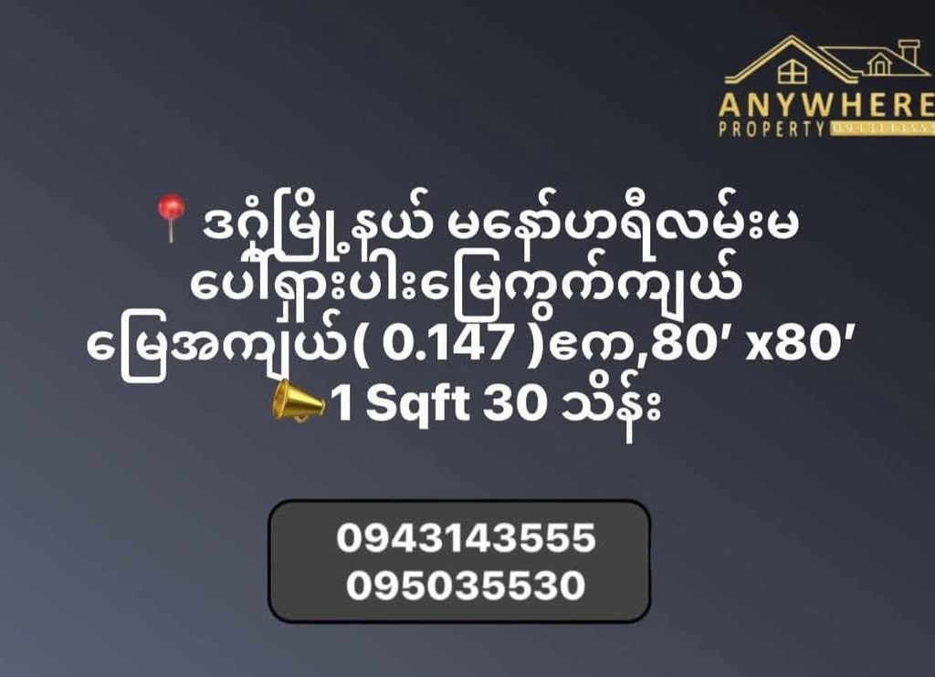| Feature | ဒဂုံမြို့နယ် ပြည်လမ်းမကြီးအနီး၊ ဟယ်လ်ပင်မှတ်တိုင်အနီး၊ မနော်ဟရီလမ်းမပေါ်မှာအရောင်းရှားတဲ့ မြေပိုင်မြေ မြေကွက်ကျယ်ရောင်းမည် • ( 0.147 ) ဧက ပေ ( 80' × 80' ) • မြေပိုင်မြေ အမည်ပေါက်၊မြေ လေးထောင့်ကျ ▫️1 Sqft သိန်း(30) |