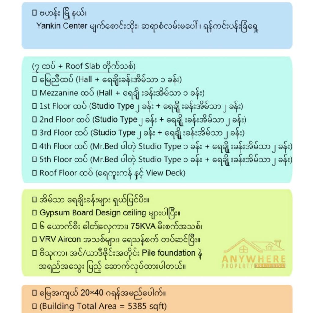 | Feature | 🔹မြေညီနှင့်ထပ်ခိုးထပ်။ 🔹Studio type လေး 2Units ပါတဲ့ အထပ်၃ထပ်။ 🔹1MB 1 StyB ပါ Family type လေး 1Unit ပါတဲ့ အထပ် ၂ထပ်။ 🔹Roof Deck ပေါ်မှာ View အပြည့်နဲ့ ရေကူးကန် ၁ထပ်။ ကြမ်းခင်းကြွေပြား Korea တံခါးများ အိမ်သာရေချိုးခန်းများ ရှယ်ပြင်ထား။ design ceiling များပါပြီး။ - အခန်းအသေး 1Hall+1BathWC + Kitchen /6ခန်း။ - အခန်းအကြီး 1Hall+1MB BathWC + 1SB+ Common Bath WC + Kitchen+ Dinning 2ခန်း။ စုစုပေါင်း ၈ခန်းပါဝင်ပါတယ်။ 🔹၆ယောက်စီး ဓါတ် လှေကား။ 75KVA အသစ်စက်စက်မီးစက်။ VRV Aircon အသစ် စက်စက်များ။ ရေသန့်စက်။ Pile foundation နဲ့ တည်ဆောက်ထားပါတယ်။ 🔹မြေ 20×40 ဂရန်အမည်ပေါက်။ Building(5385 sqft) |