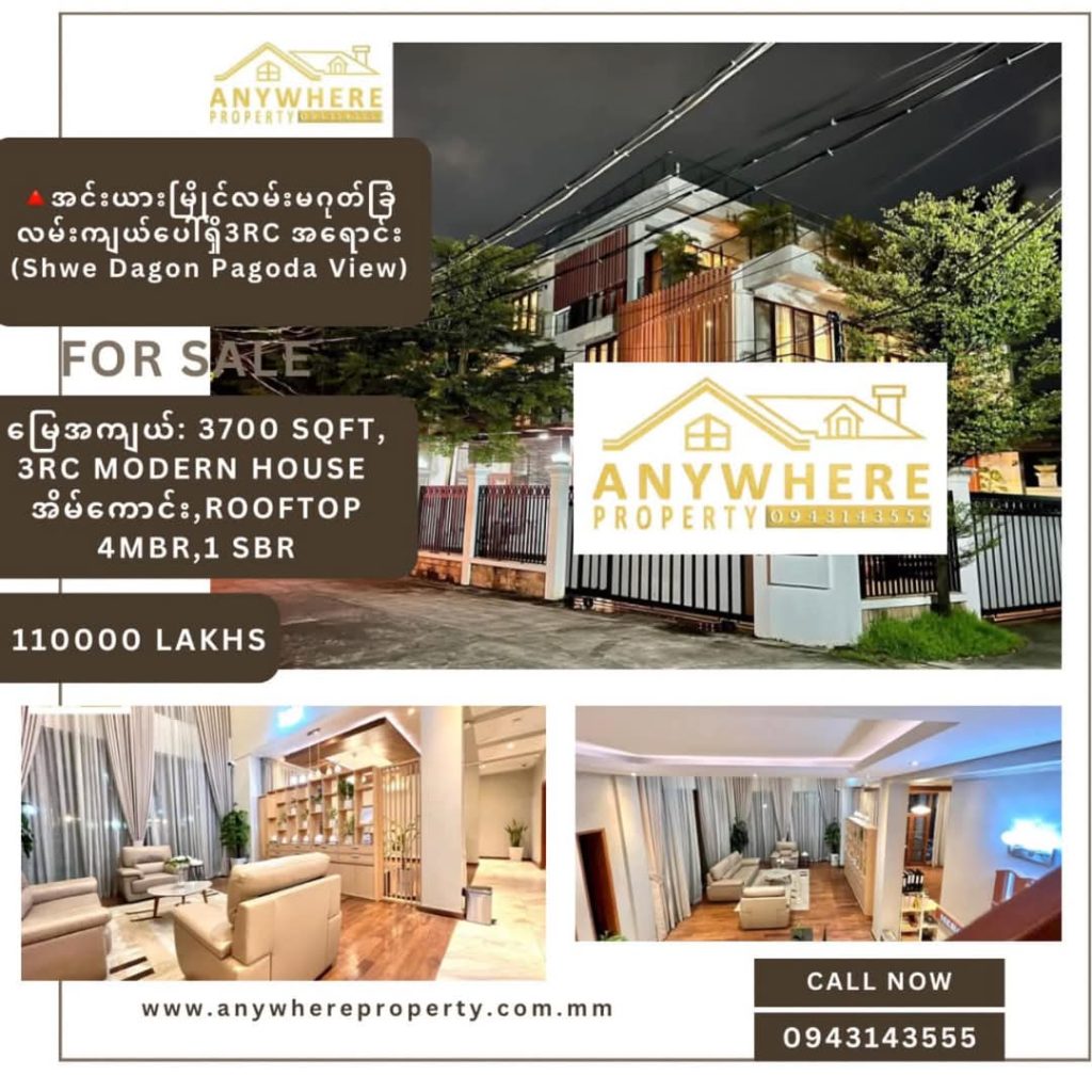 မြေအကျယ် : 3700 sqft, 3RC modern house အိမ်ကောင်း, 4 master bedrooms, 1 single bedroom, roof slab, shwe dagon pagoda view