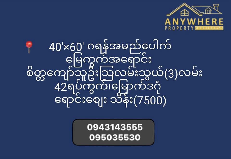40’×60′ ဂရန်အမည်ပေါက်မြေကွက်အရောင်း